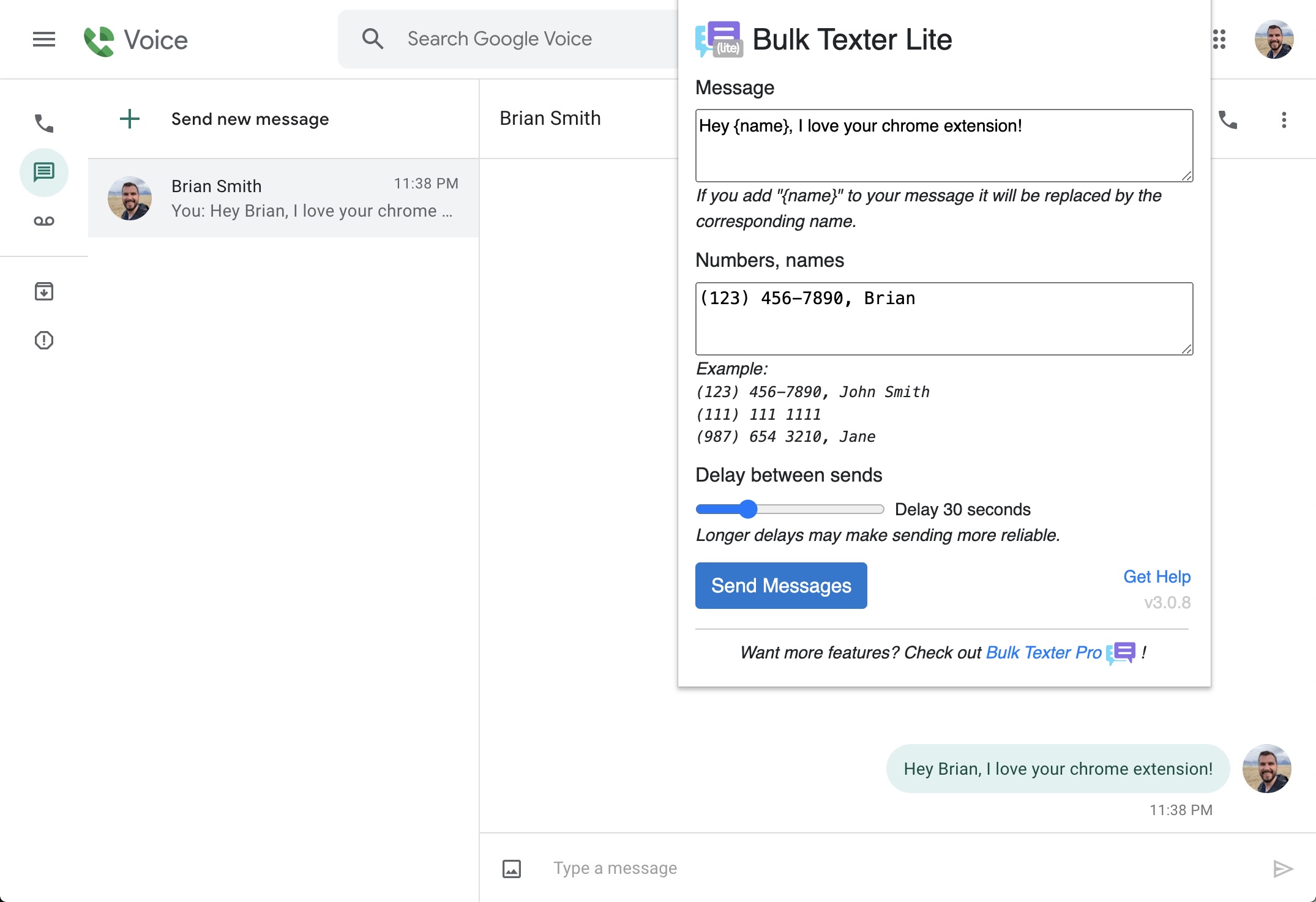 Bulk Texter Lite (formerly called Google Voice Bulk Texter) is a browser extension that can send personalized bulk SMS text messages via Google Voice.